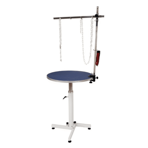 - Plateau Robuste et Esthétique: Le plateau en contreplaqué rond bleu ajoute une touche de style à votre espace de toilettage.